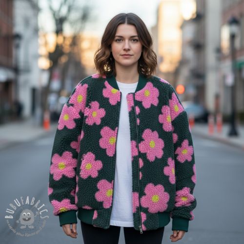 Tessuto per cappotti TEDDY JACQUARD Flowers army green/pink